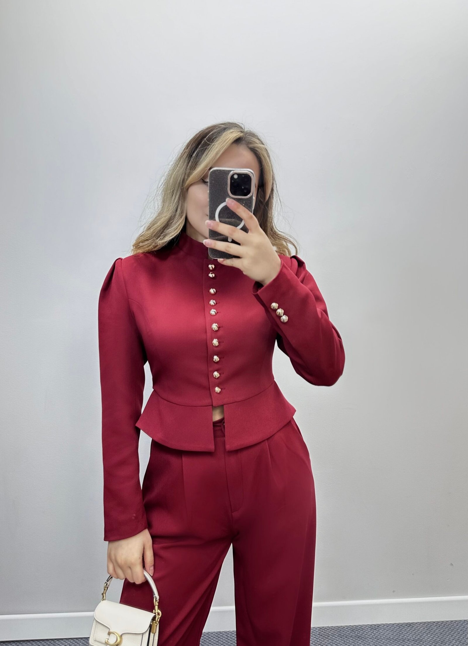Kadın Kırmızı İkili Takım Gold Düğme Detaylı Şık Yelek Pantolon Takım