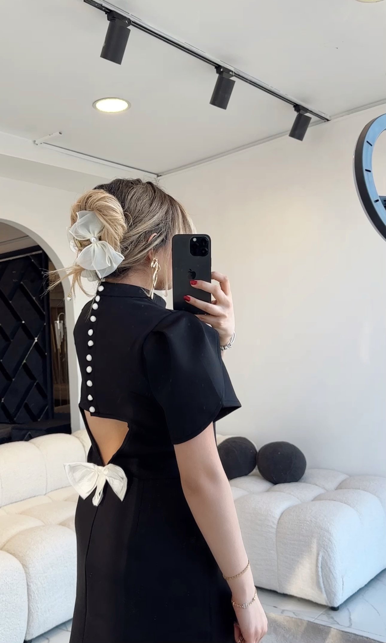 Sırt Dekolteli Düğme Detay Siyah Mini Elbise quantity
