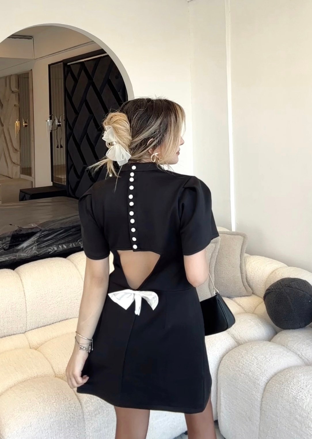 Sırt Dekolteli Düğme Detay Siyah Mini Elbise